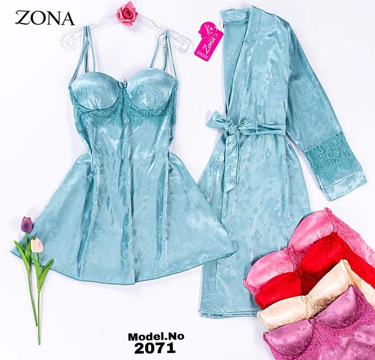 استمتعي بالرقي مع طقم ZONA 2071 المكون من قميص نوم قصير وروب متطابق بخامة الستان المشجر الفاخرة. يتميز القميص بصدر كب مطرز بالدانتيل مع حمالات رفيعة، بينما يضيف الروب لمسة ملكية بأكمامه المزينة بالدانتيل العريض