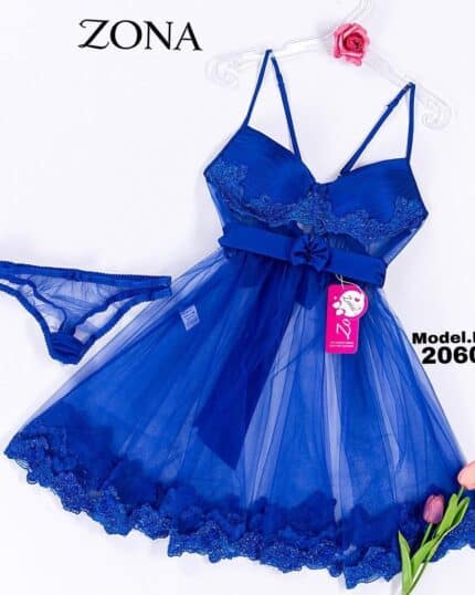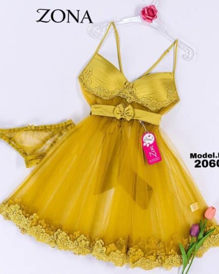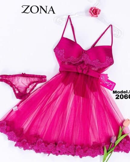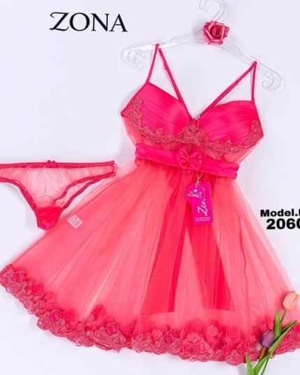 إطلالة جريئة وناعمة مع موديل 2060. بيبي دول من التول الشفاف، يتميز بصدر محدد وتطريز دانتيل فاخر على الحواف وفيونكة ستان أنيقة عند الخصر. الطقم يأتي مع بانتيه تول مطابق
